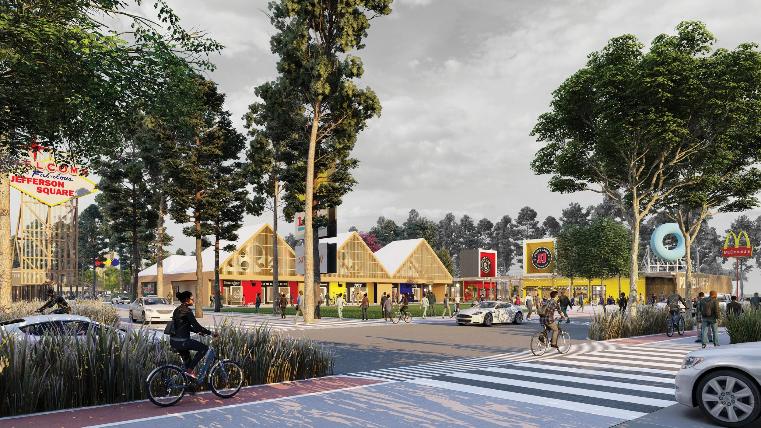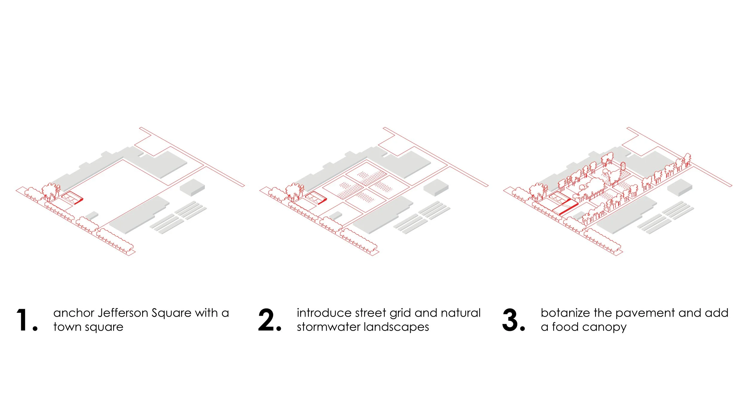 We asked: what if the Jefferson Square parking lot was infilled with a street grid anchored by a true neighborhood square at Highway 63B? The square organizes a new open-air food canopy with two fast casual dining restaurants, food trucks, and itinerant food vendors. A new building for small tenants or a much needed grocery store faces the new Olive Street. The square anchors a larger productive landscape that ecologically manages urban stormwater, while mitigating the parking lot’s heat island effect with new tree canopies—we botanize the pavement. Substituting car parking for new neighborhood park spaces makes sense for a community where 30 percent of families do not own a car. Both the street and shopping center retrofit provide a new shade economy in an Arkansas delta neighborhood where heat can be deadly.