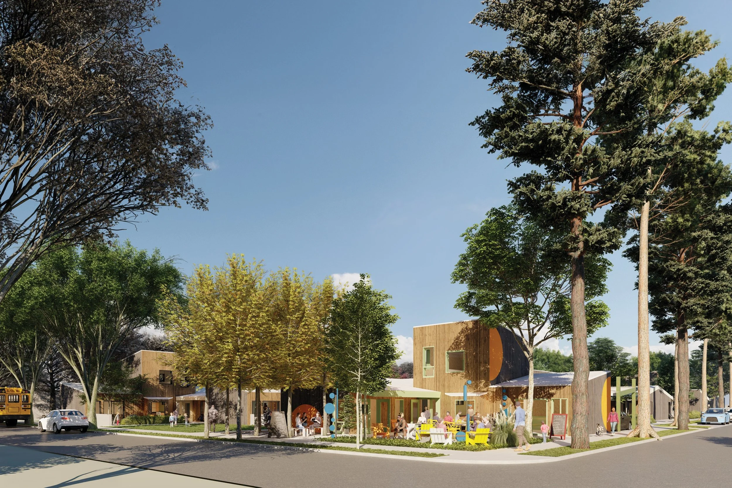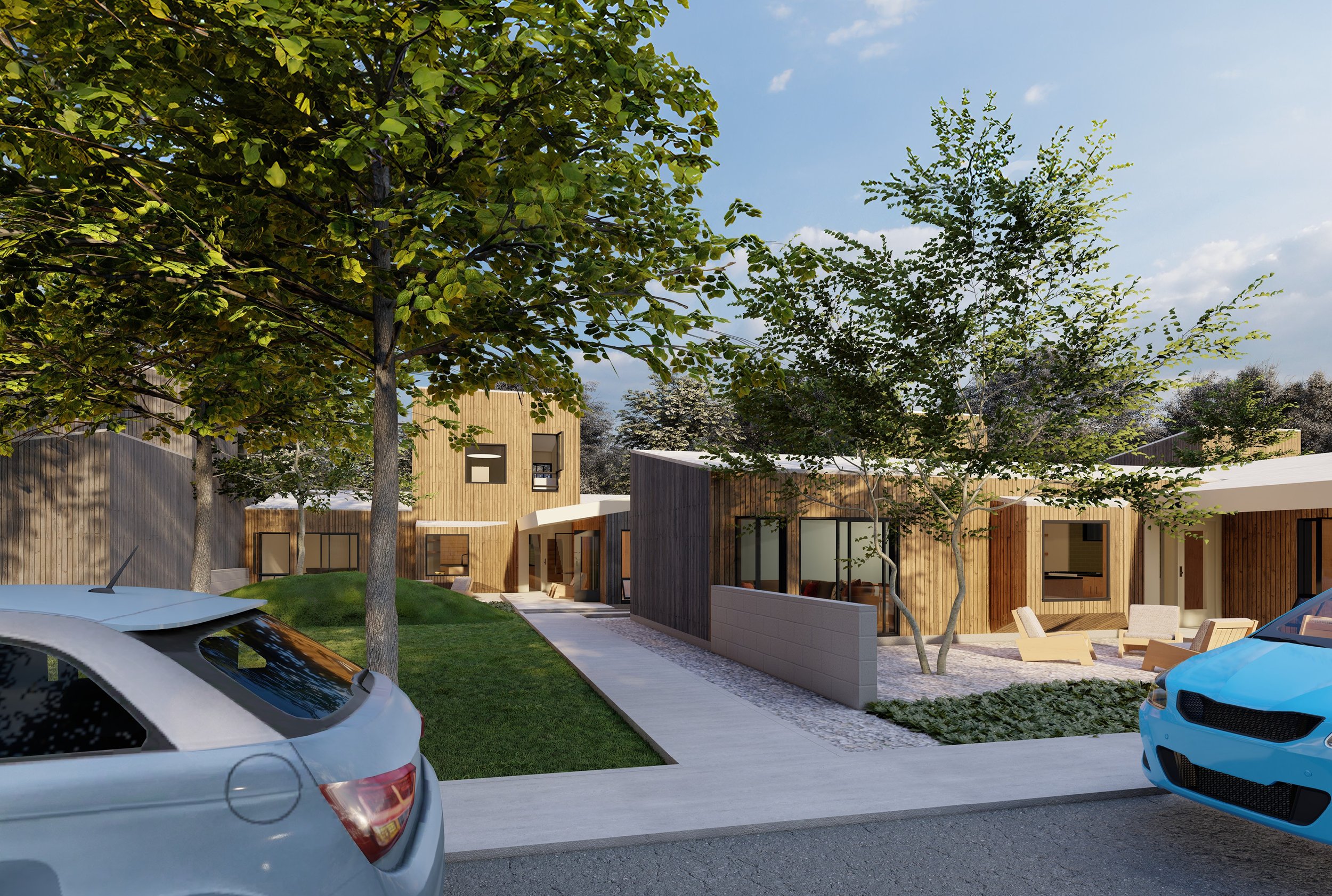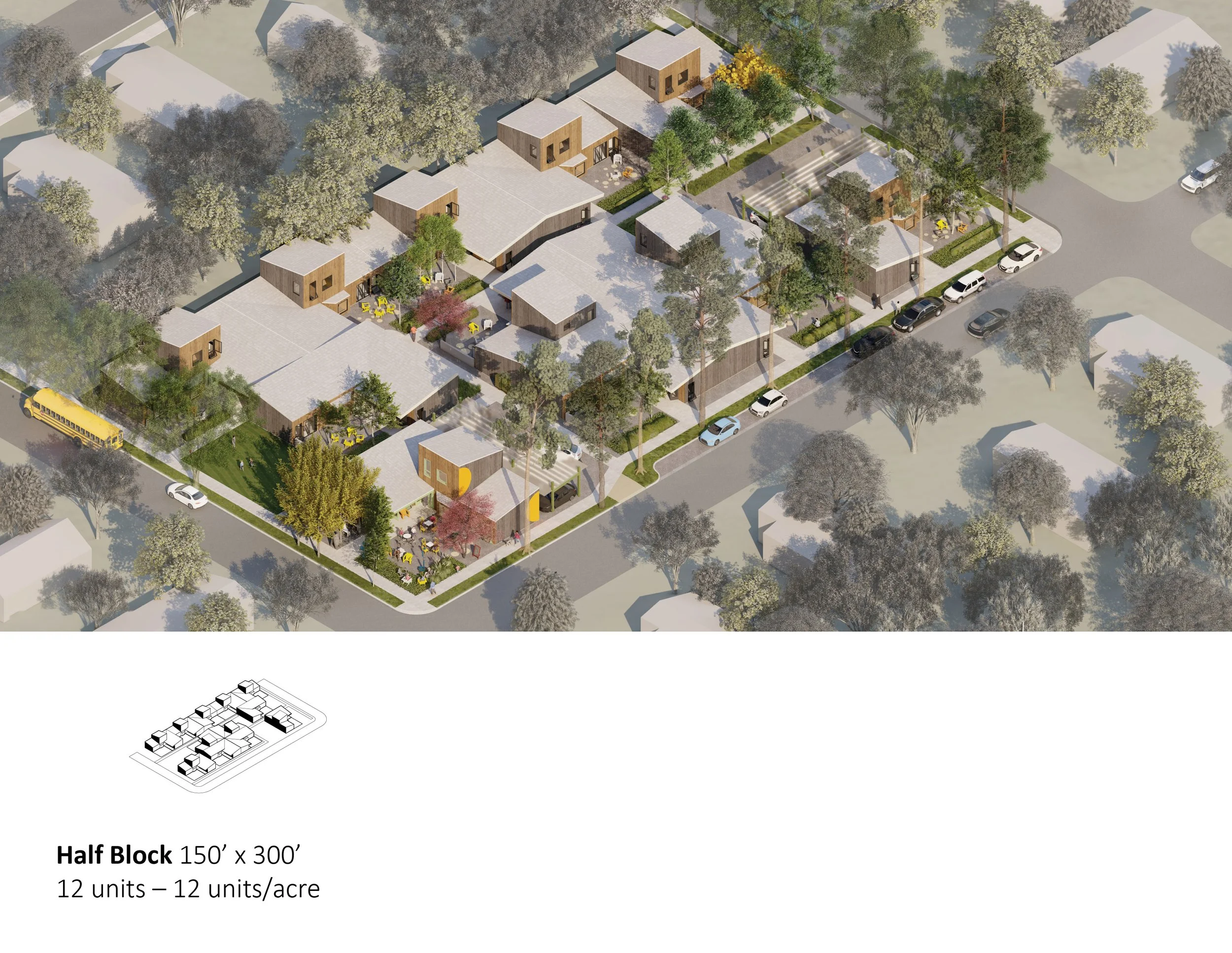 Housing-neighborhood complexes are multifamily derivatives of single-family housing that incorporate communal space, where shared external spaces like pedestrian walks and micro-greens extend the home’s footprint. Cooperative housing addresses multiple challenges related to affordability, downtown revitalization, and care deficits commonly experienced among children and seniors. Housing-neighborhood complexes bring back the missing middle scale of housing that has not been built in the U.S. for 80 years. The L-Loft elevates average mid-size American town densities from 8 units per acre (3.2 ha) to at least 15 units per acre (6.1 ha) while maintaining household autonomy.