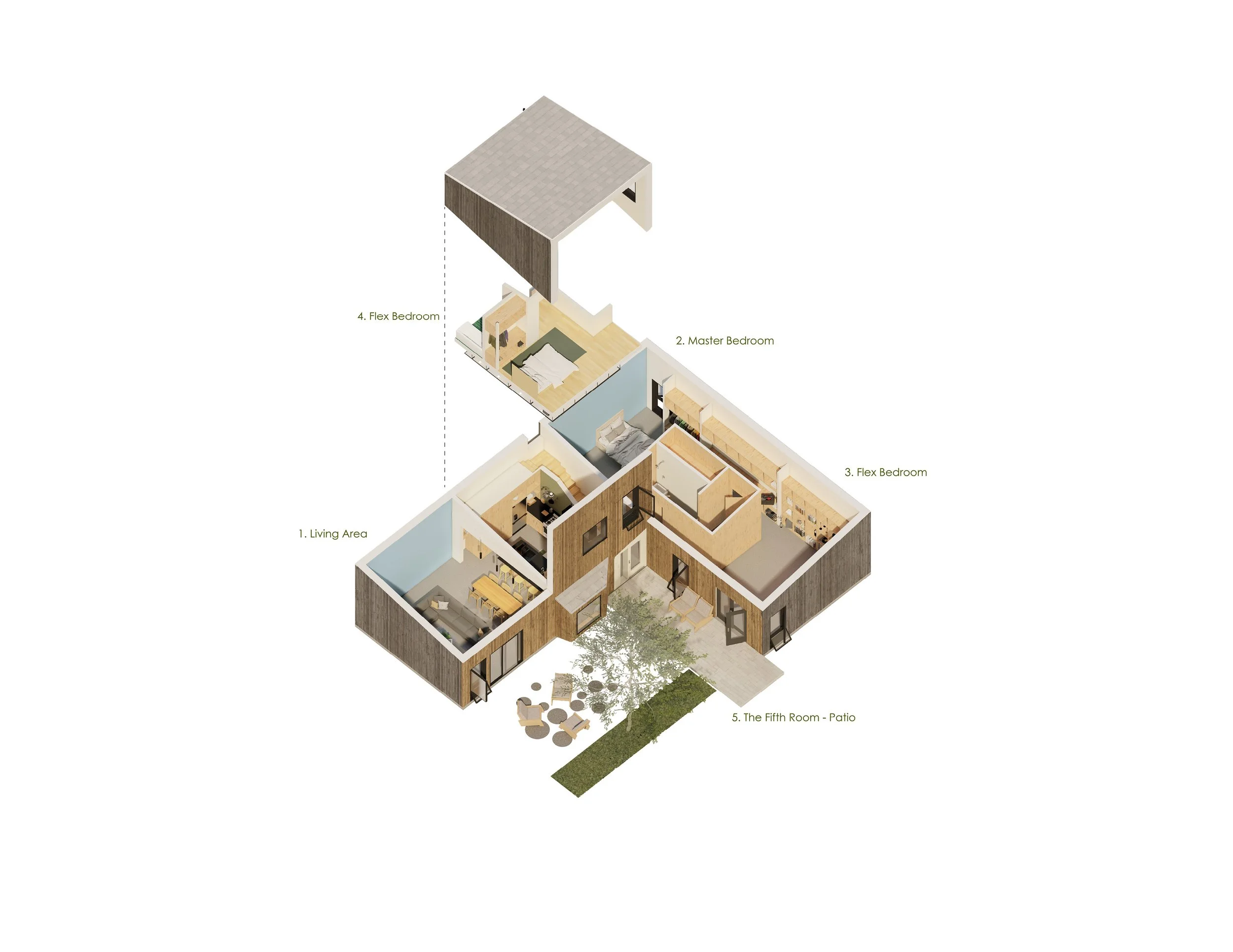 The unit prototype for a housing-neighborhood complex triangulates three concepts in design for creation of resilient and green housing environments. First, the proposal substitutes prefabricated construction technology in SIPs (structural insulated panels) with high energy efficiencies approaching Passive House standards for energy-wasting light wood frame construction. Second, housing affordability is achieved through a small unit footprint of 1,500 square-feet (139 square meters) with flexible open space adaptive to working and/or living. Third, the L-Loft’s geometry promotes a wide spectrum of planning replicability from small urban infill to neighborhood-scaled development with a lot of formal variety.